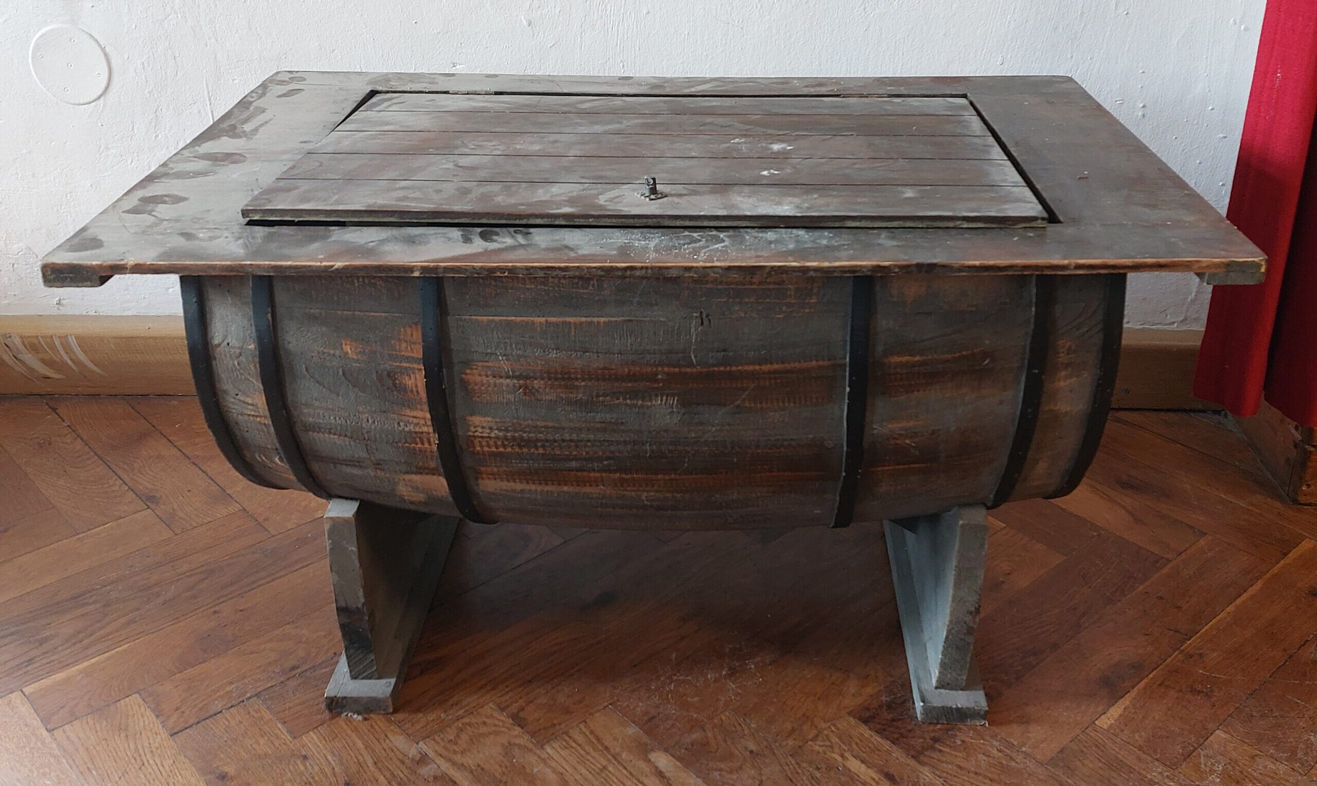 Ein Abstelltisch in Form eines halben Fasses. Mit einem Innenfach.
